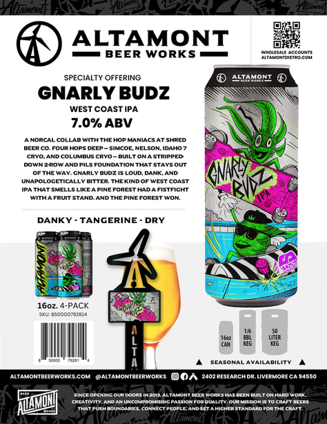 A NorCal collab with the hop maniacs at Shred Beer Co. out of Rocklin. Four hops deep — Simcoe, Nelson, Idaho 7 Cryo, and Columbus Cryo — built on a stripped-down 2-Row and Pils foundation that stays out of the way. Gnarly Budz is loud, dank, and unapologetically bitter. The kind of West Coast IPA that smells like a pine forest had a fistfight with a fruit stand. And the pine forest won.